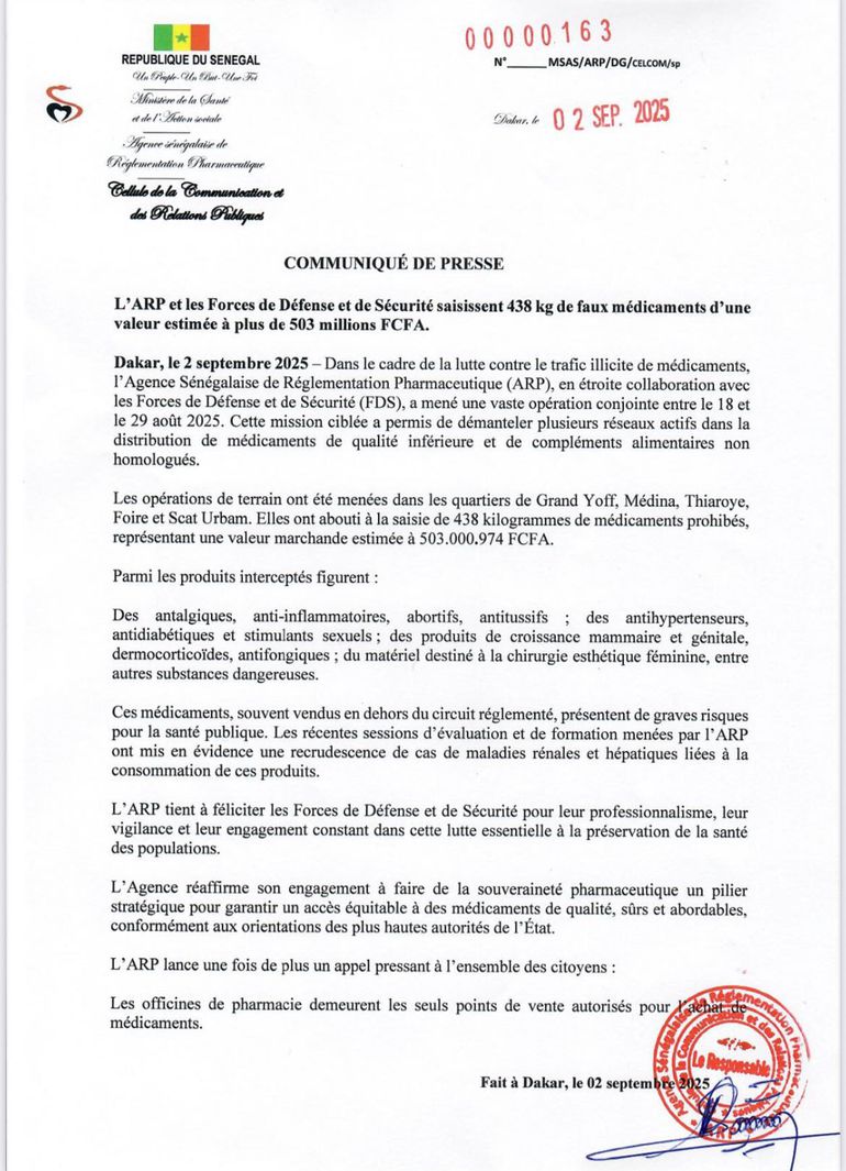 Une vaste opération conjointe de l’Agence Sénégalaise de Réglementation Pharmaceutique (ARP) et des Forces de Défense et de Sécurité (FDS) a abouti à la saisie 438 kilogrammes de faux médicaments, dont la valeur marchande est estimée à plus de 503 millions FCFA. Menée entre le 18 et le 29 août 2025, cette mission ciblée a abouti au démantèlement de plusieurs réseaux actifs dans la distribution de médicaments de qualité inférieure et de compléments alimentaires non homologués.