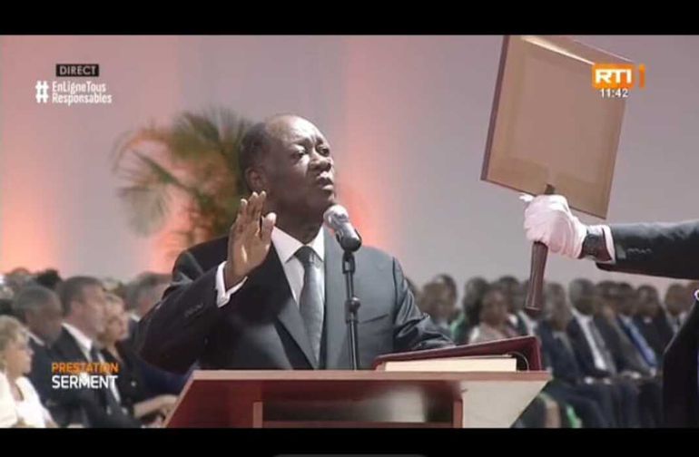 « Devant le peuple souverain de Côte d’Ivoire, je jure solennellement et sur l’honneur de respecter et de défendre fidèlement la Constitution, d’incarner l’unité nationale (…) de remplir consciencieusement les devoirs de ma charge dans l’intérêt supérieur de la Nation », a-t-il déclaré, main droite levée et main gauche sur la Constitution.