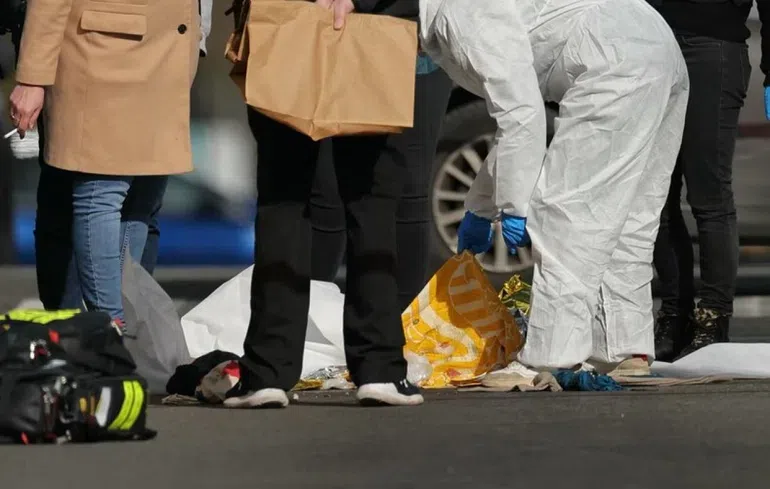Alors que des passants regardent en sa direction et qu'un mendiant se lève et s'éloigne, l'homme accélère le pas brutalement et tente visiblement de frapper une personne avec sa lame, laquelle parvient à l'esquiver
