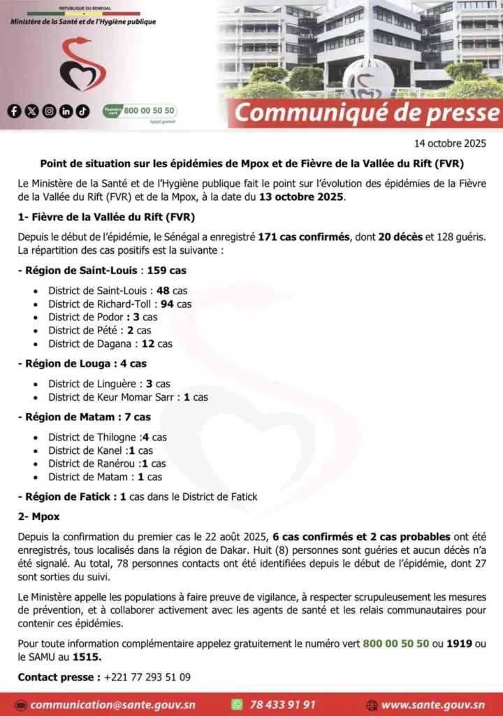 Le Ministère de la Santé et de l’Hygiène publique a publié ce mardi un point de situation sur les épidémies de Fièvre de la Vallée du Rift (FVR) et de Mpox, arrêté au 13 octobre 2025.