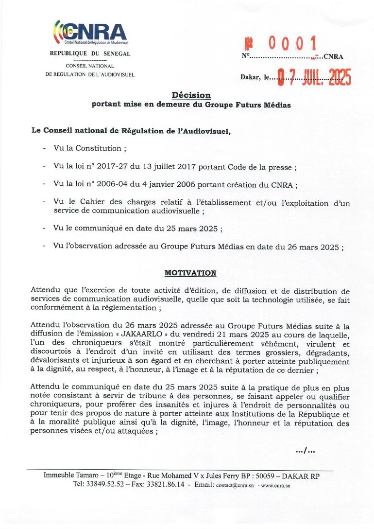 Le Conseil national de Régulation de l’Audiovisuel (CNRA) a publié, ce lundi 7 juillet 2025, une décision de mise en demeure contre le Groupe Futurs Médias (GFM), en lien avec les dérives constatées dans l’émission « Jakaralo » diffusée sur TFM.