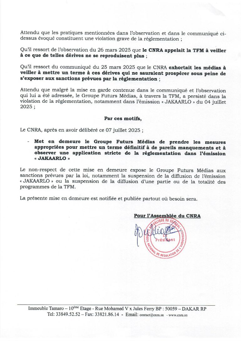 Par conséquent, le CNRA met en demeure le Groupe Futurs Médias « de prendre les mesures appropriées pour mettre un terme définitif à pareils manquements », en ciblant spécifiquement l’émission « Jakaralo ». Il prévient que le non-respect de cette mise en demeure expose la chaîne à des sanctions, conformément aux textes en vigueur.