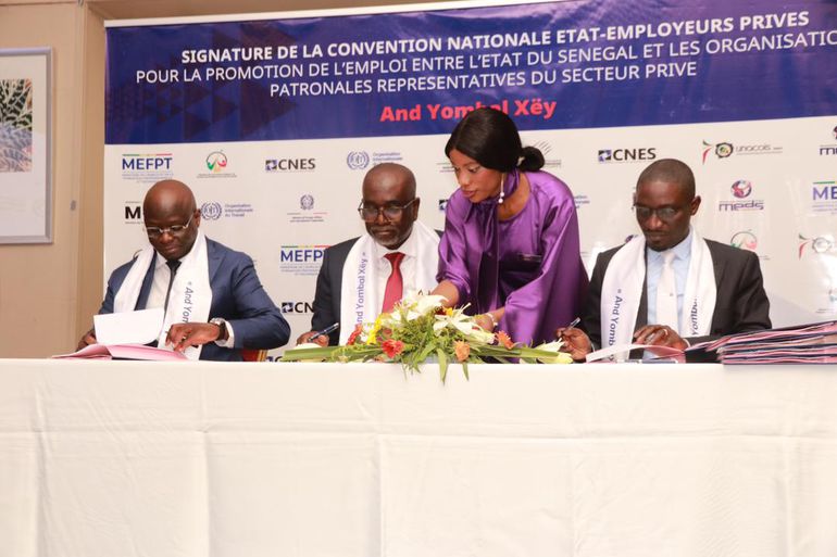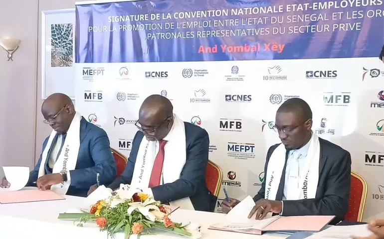 Pour inverser la tendance, le ministère de l'Emploi, en partenarait avec le ministère du Travail et le ministère des Finances et le Secteur privé a procédé au lancement de la nouvelle Convention nationale État–employeurs privés (CNEE). Ladite convention a été paraphée, ce jeudi, par les ministres des Finances et du Budget, Cheikh Diba, de l’Emploi et de la Formation professionnelle et technique, Moustapha Ndieck Sarré, ainsi que de la Fonction publique et de la Réforme du service public, Olivier Boucal, en présence des organisations patronales.