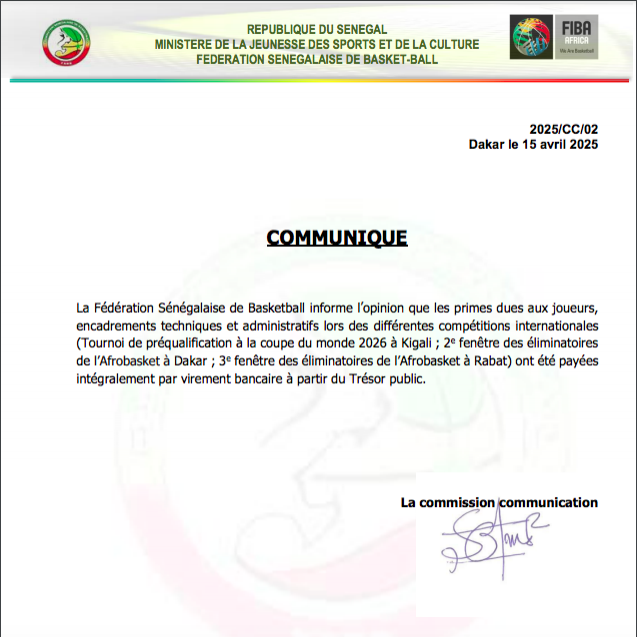 La Fédération sénégalaise de basket-ball (FSBB) a annoncé que les primes dues aux joueurs à l'issue des dernières compétitions internationales, ont été payées."La Fédération Sénégalaise de Basketball informe l’opinion que les primes dues aux joueurs ,encadrements techniques et administratifs lors des différentes compétitions internationales (Tournoi de préqualification à la coupe du monde 2026 à Kigali ; 2e fenêtre des éliminatoires de l’Afrobasket à Dakar ; 3e fenêtre des éliminatoires de l’Afrobasket à Rabat) ont été payées intégralement par virement bancaire à partir du Trésor public", informe un communiqué de l'instance.