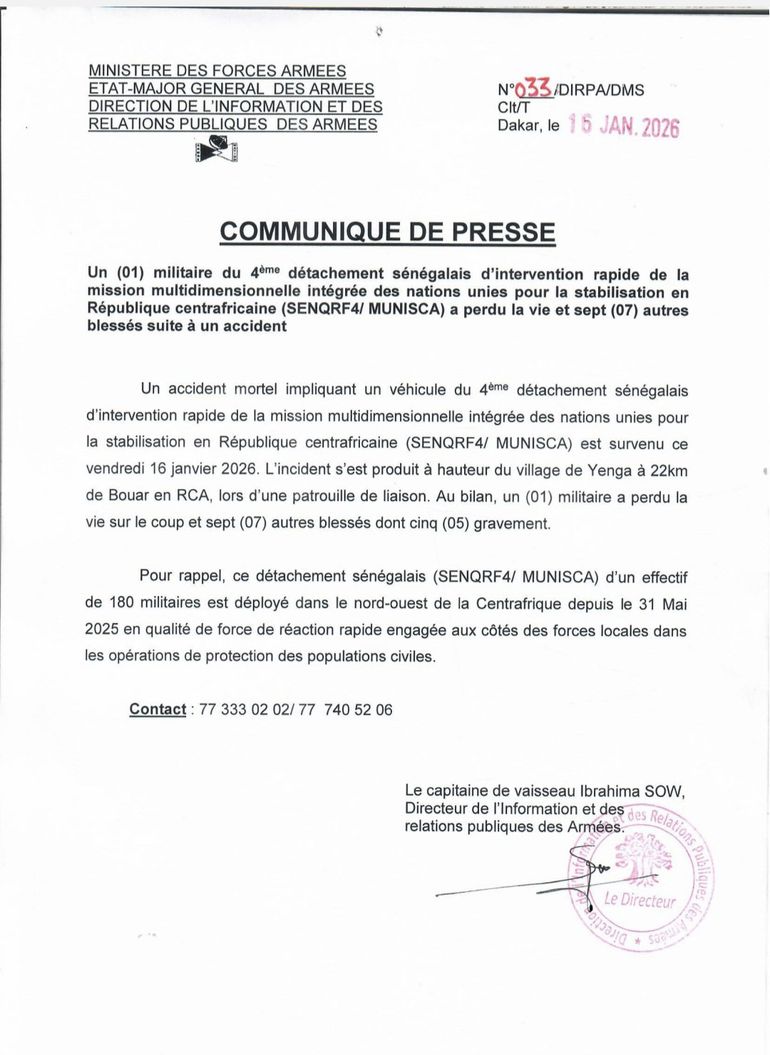 La Mission multidimensionnelle intégrée des Nations Unies pour la stabilisation en République centrafricaine (MINUSCA) est en deuil. Un militaire sénégalais a perdu la vie et sept autres ont été blessés, dont cinq grièvement, à la suite d’un accident impliquant un véhicule du 4ᵉ détachement sénégalais d’intervention rapide, a annoncé la Direction de l’information et des relations publiques des Armées (Dirpa).