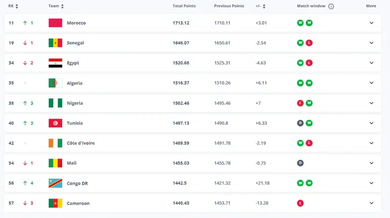 L’Égypte, 3ᵉ africaine et 34ᵉ mondiale, continue sa chute et peine à retrouver son influence. Juste derrière, l’Algérie, 4ᵉ africaine et 35ᵉ mondiale, signe l’une des meilleures progressions du mois. Le Nigeria, 5ᵉ africain et 38ᵉ mondial, gagne trois places, tout comme la Tunisie, 6ᵉ africaine et 40ᵉ mondiale, portée par une série encourageante. La Côte d’Ivoire, 7ᵉ africaine et 42ᵉ mondiale, reste dans le groupe de tête malgré une évolution irrégulière. Plus bas, le Mali, 8ᵉ africain et 54ᵉ mondial, recule légèrement. La RD Congo, 9ᵉ africaine et 56ᵉ mondiale, signe la plus forte hausse du mois, preuve d’un regain de forme. Enfin, le Cameroun, 10ᵉ africain et 57ᵉ mondial, dégringole de trois places et illustre une instabilité persistante.