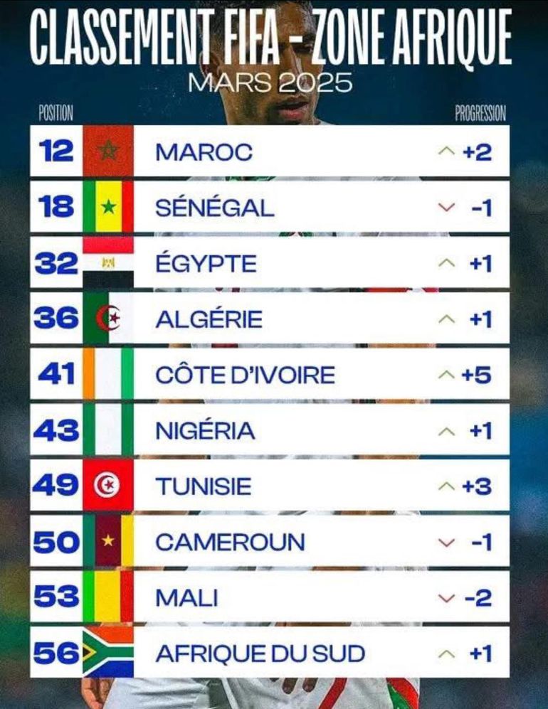 Sur le continent africain, le Sénégal maintient néanmoins sa position de deuxième meilleure sélection, derrière un Maroc en pleine ascension. Les Lions de l’Atlas ont progressé de deux rangs pour atteindre la 12ème place mondiale. Le podium africain est complété par l’Égypte, suivie de l’Algérie, la Côte d’Ivoire, le Nigeria et la Tunisie.