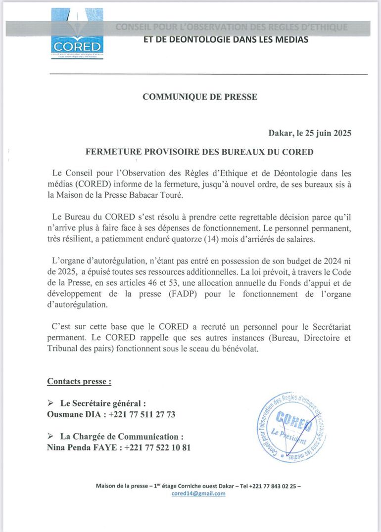 Le Conseil pour l’Observation des Règles d’Éthique et de Déontologie dans les médias (CORED) a décidé de fermer ses bureaux situés à la Maison de la presse à Dakar. En cause : des difficultés financières persistantes qui ne permettent plus à l’institution de faire face à ses charges de fonctionnement, selon un communiqué de l’organisation.
