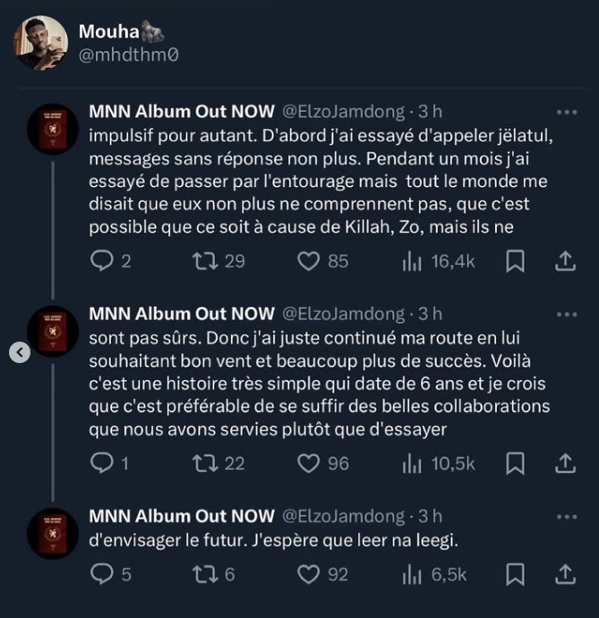 Le mystère entourant la rupture entre Elzo Jamdong et Dip Doundou Guiss, deux figures majeures du hip-hop sénégalais, vient d’être éclairci. Après six ans de silence, Elzo a décidé de s’exprimer pour la première fois sur la raison de leur éloignement. Dans un post devenu viral, l’auteur de Beuss Na raconte avec calme et franchise la manière dont il a découvert la fin de leur complicité : « Je me suis réveillé un beau jour et j’ai vu que le gars m’a unfollow partout. Je n’ai rien compris. Pendant un mois, j’ai continué à l’appeler et à lui envoyer des messages, mais sans réponses. J’ai fini par laisser tomber et me concentrer sur moi-même. Voilà, un problème très simple », a écrit Elzo.