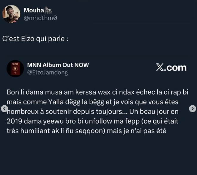Ces mots simples mettent un terme à des années de suppositions. Depuis leur séparation, les fans des deux rappeurs s’étaient livrés à de nombreuses interprétations, certains évoquant des rivalités musicales, d’autres des désaccords personnels. Autrefois très proches, Dip et Elzo avaient collaboré sur plusieurs titres et partageaient une véritable alchimie artistique. Leur éloignement soudain avait créé un vide dans la scène hip-hop sénégalaise, où les deux artistes représentaient deux générations et deux styles complémentaires. Si Elzo semble aujourd’hui apaisé, cette déclaration a ravivé le débat parmi leurs fans, partagés entre nostalgie et incompréhension. De son côté, Dip Doundou Guiss ne s’est pas encore exprimé publiquement sur le sujet.