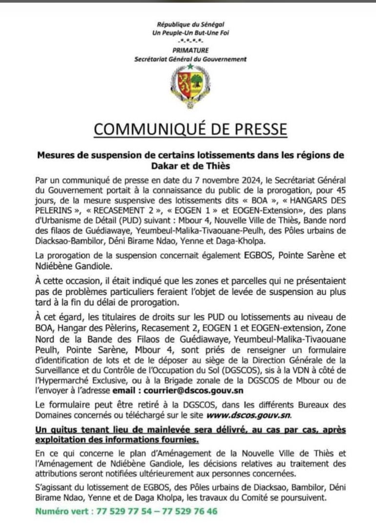 Le Secrétariat général du gouvernement avait annoncé, dans un communiqué en date du 7 novembre 2024, la prolongation de la suspension de plusieurs lotissements dans les régions de Dakar et Thiès pour une période de 45 jours.