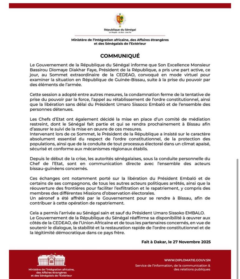 Le Sénégal a joué un rôle actif au cours de cette réunion virtuelle, insistant sur la protection des populations et la nécessité de garantir un climat apaisé pour tout processus électoral. L’arrivée « saine et sauve » du président Embaló à Dakar constitue un signal fort de soutien régional et souligne l’engagement du Sénégal à collaborer avec la CEDEAO, l’Union Africaine et les partenaires internationaux pour faciliter le dialogue et la restauration rapide de l’ordre constitutionnel en Guinée-Bissau.