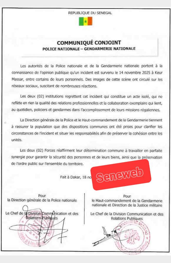 La Police nationale et la Gendarmerie nationale ont tenu à apaiser les inquiétudes nées de l’incident survenu le 14 novembre 2025 à Keur Massar. Dans un communiqué, les deux forces ont reconnu les faits tout en insistant sur leur volonté de préserver la cohésion entre leurs unités.