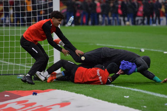 Une séquence déjà observée lors de la demi-finale face au Nigeria. Mais cette fois, Yehvann Diouf, la doublure d’Edouard Mendy chez les Lions de la Teranga, a donné de sa personne pour protéger la serviette de son compatriote tandis que les stadiers essayaient de lui arracher.