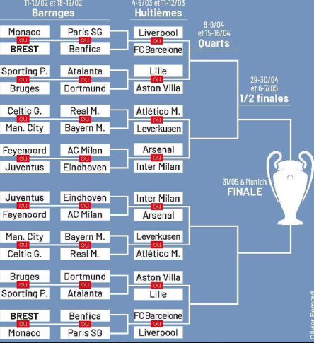 Les autres, celles classées de la 9e à la 24e place, où l’on retrouve les quatre formations tricolores, joueront leur place en huitièmes les 11/12 et 18/19 février prochains, avec, en principe, un match retour à domicile pour les équipes ayant terminé entre le 9e et le 16e rang : Atalanta Bergame, Borussia Dortmund, Real Madrid, Bayern Munnich, AC Milan, PSV Eindhoven, PSG, Benfica Lisbonne, AS Monaco, Stade Brestois, Bruges, Celtic Glasgow, Juventus Turin, Manchester City, Sporting Lisbonne, Feyenoord Rotterdam.