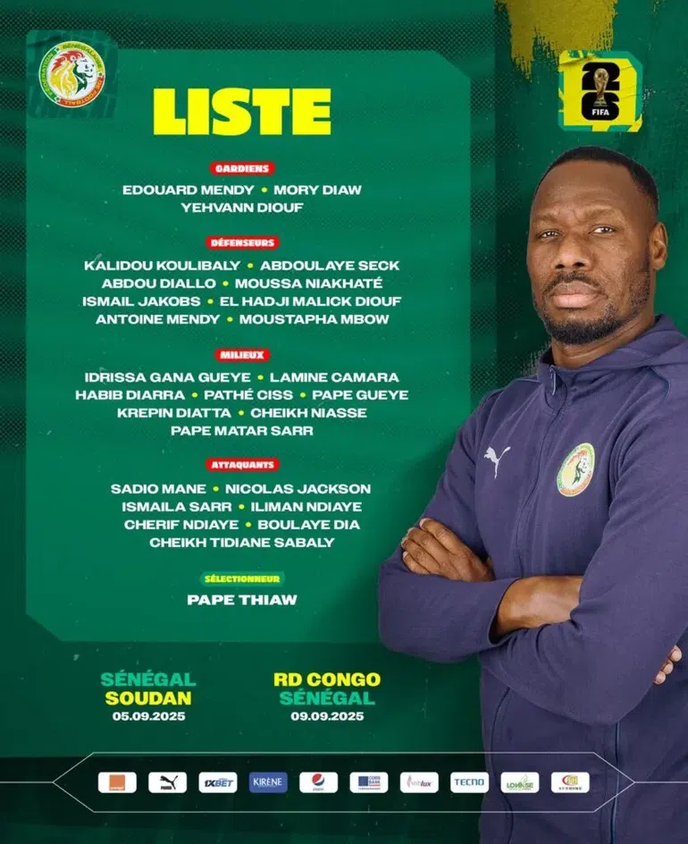 Le sélectionneur national du Sénégal Pape Thiaw vient de publier sa liste des joueurs convoqués pour les matchs contre le Soudan et la RD Congo, comptant pour les éliminatoire de la Coupe du Monde 2026. Il a convoqué les même joueurs que d’habitude à l’exception de Moustapha Mbow, appelé pour la première fois en équipe nationale du Sénégal. Le défenseur central du Paris FC, auteur d’une solide saison en Ligue 2, connaît sa première convocation en équipe nationale à 25 ans.