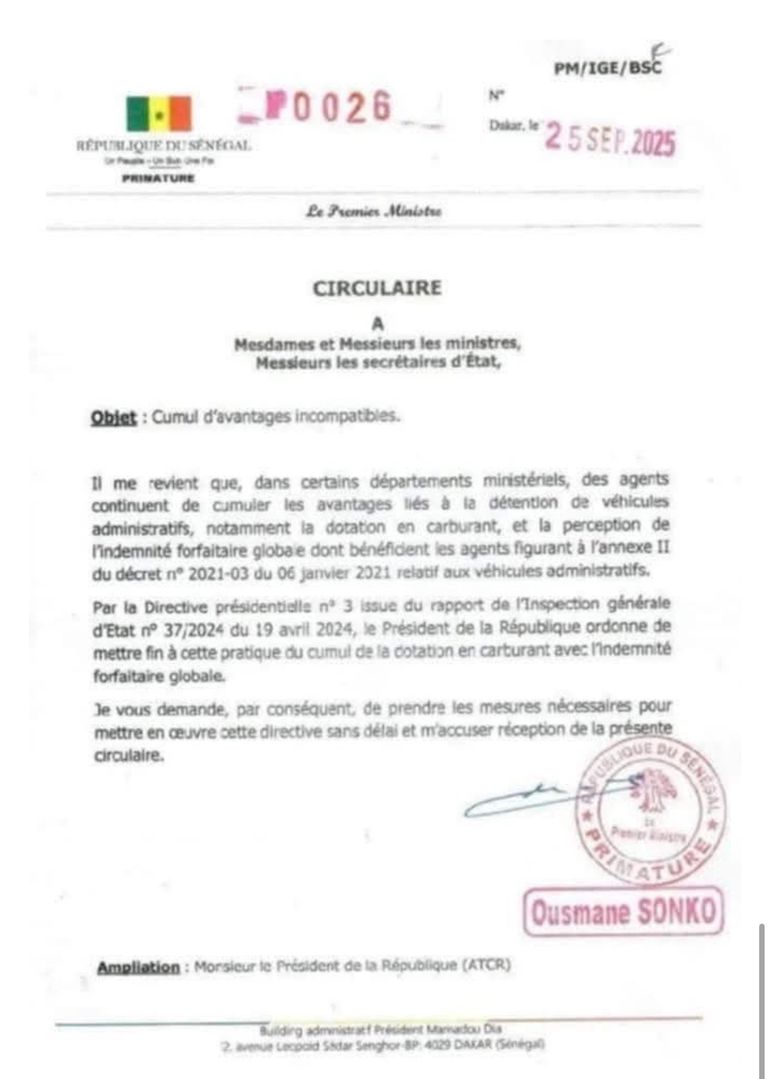 Le gouvernement resserre la vis sur la gestion des avantages administratifs. Dans une note datée du 25 septembre 2025, Ousmane Sonko a rappelé aux ministres et secrétaires d’État la stricte application des dispositions du décret n°2021-03 du 6 janvier 2021 relatif à la gestion des véhicules de l’État. Selon cette circulaire, plusieurs départements ministériels continuent d’octroyer à certains agents les deux avantages cumulativement : la mise à disposition d’un véhicule de service et la perception d’une dotation en carburant.