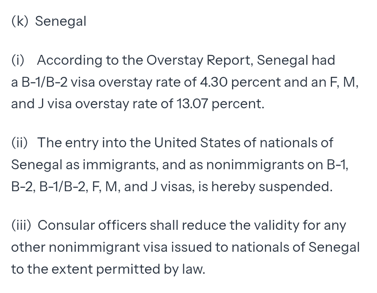 Selon ce rapport, 4,30 % des titulaires de visas de tourisme et d’affaires (B-1/B-2) et 13,07 % des détenteurs de visas étudiants et d’échanges (F, M, J) sénégalais ont dépassé la durée autorisée de leur séjour aux États-Unis. En conséquence, la Proclamation suspend l’entrée des ressortissants sénégalais sous les catégories de visas B-1, B-2, B-1/B-2, F, M et J, ainsi que l’entrée en tant qu’immigrants. Les officiers consulaires américains sont également autorisés à réduire la durée de validité de tout autre visa non-immigrant accordé aux citoyens sénégalais. Ces mesures concernent uniquement les individus se trouvant en dehors des États-Unis et ne possédant pas de visa valide au moment de l’application du décret.