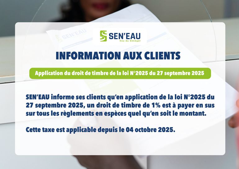 La société SEN’EAU annonce l’application d’une taxe de 1% sur tous les paiements effectués en espèces, conformément à la loi N°2025 du 27 septembre 2025. La mesure est en vigueur depuis le 4 octobre 2025 et concerne tous les montants, sans exception.