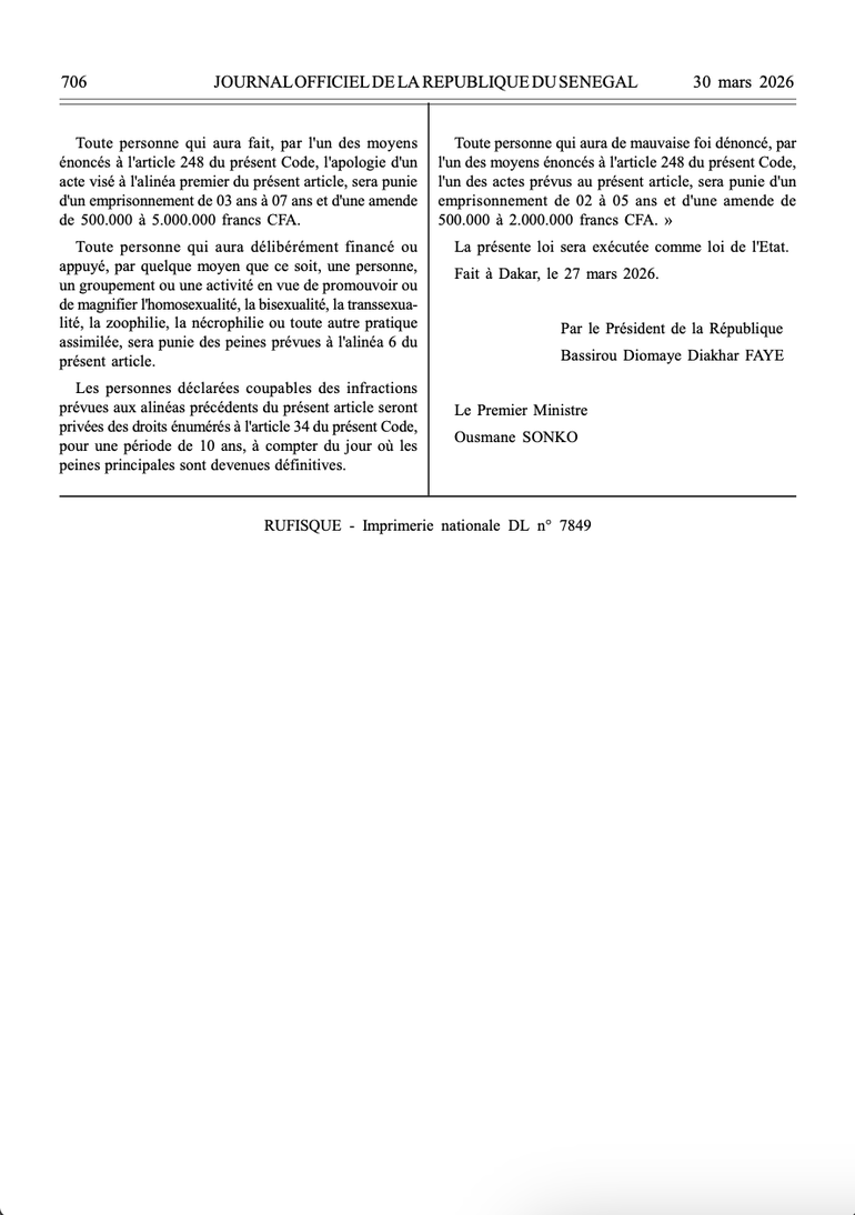 A présent, la loi n° 2026-08 du 27 mars 2026, modifiant l'article 319 de la loi n° 65-60 du 21 juillet 1965, a été promulguée par le Président de la République. Le texte, qui clarifie la notion d'acte contre nature et durcit les sanctions, va, à présent, pouvoir s'appliquer. Ci-dessous les détails de ladite loi tels que publiés dans le journal officiel du lundi 30 mars 2026.