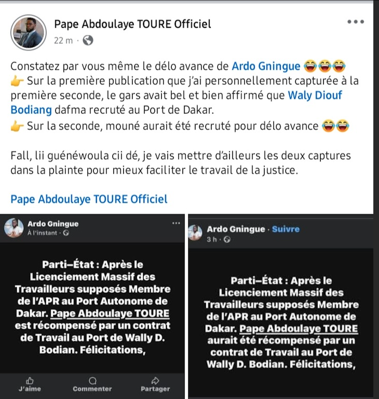 La publication a ensuite été nuancée par l’activiste avec l’emploi du conditionnel : "Pape Abdoulaye TOURE aurait été récompensé par un contrat de Travail au Port de Wally D. Bodian. Félicitations." Face à ces déclarations, Pape Abdoulaye Touré a réagi publiquement sur ses propres réseaux sociaux. Il a indiqué qu’il se réservait le droit d’agir légalement si Ardo Gningue persistait dans ses affirmations : "J’espère que ce Ardo Gningue se trouve toujours sur le territoire sénégalais. Si tel est le cas, je souhaite que la Direction du Port Autonome de Dakar lui fasse délivrer une citation directe. À défaut, je me ferai le plus grand plaisir de lui offrir l’opportunité de prouver ses allégations en saisissant, sans délai, le juge compétent pour diffamation et diffusion de fausses nouvelles."