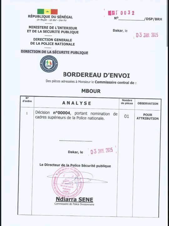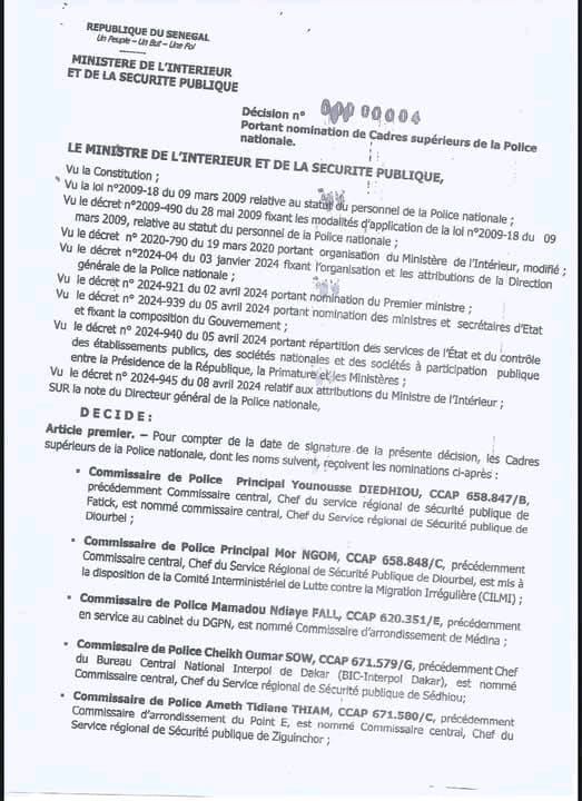 Commissaire de Police Principal Younousse DIEDHIOU, CCAP 658.847/B, précédemment Commissaire central, Chef du service régional de sécurité publique de Fatick, est nommé commissaire central, Chef du Service régional de Sécurité publique de Diourbel.