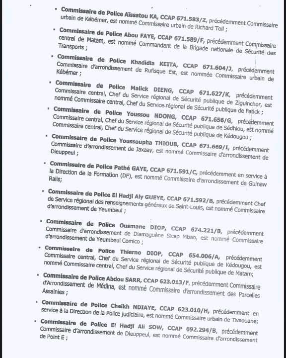 Commissaire de Police Aïssatou K, 671.583/Z, précédemment Commissaire urbain de Kébémer, est nommé Commissaire urbain de Richard Toll;