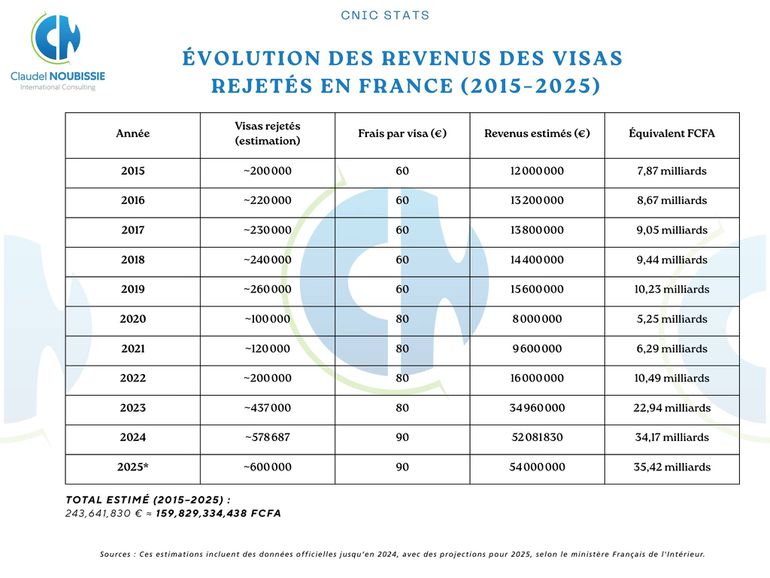 Entre 2015 et 2025, la France aurait perçu près de 243,6 millions d’euros uniquement à travers les frais de demandes de visas Schengen rejetées. Un chiffre impressionnant, d’autant plus marquant qu’il ne concerne que les demandes non acceptées. Converti en monnaie africaine, cela représente plus de 159,8 milliards de francs CFA (1 € ≈ 655,957 FCFA).