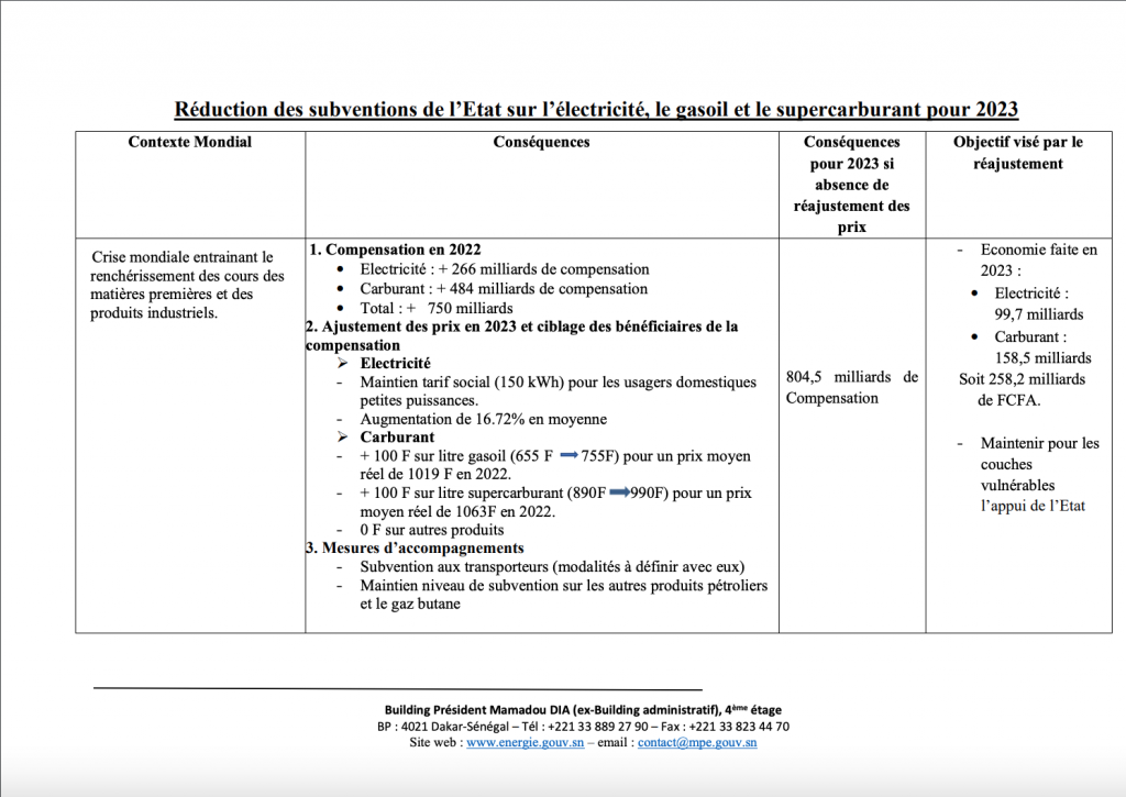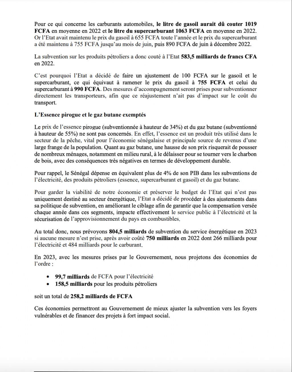Électricité, carburant : L’Etat officialise la hausse07 janvier 2023 à 07:51ShareL’Etat du Sénégal a publié le document qui détaille l'officialisation de la hausse des prix de l’électricité, du gasoil et du carburant.CarburantMMouhamadou BASuivreLe document ci-dessous :HausseHaussePUBLICITÉHausseAbonnez-vous pour recevoir des mises à jour quotidiennes.S'abonnerAccepter les conditions et la politique de confidentialitéMMouhamadou BASuivre