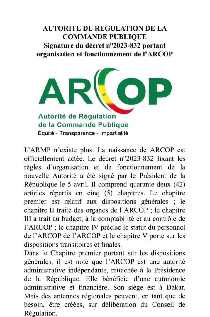 Décret supprimant l'ARMP qui devient l'ARCOP