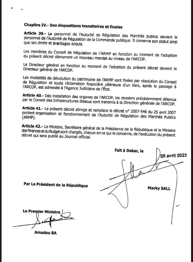 L’ARMP devient officiellement, ce jeudi 27 avril 2023, l’Autorité de Régulation de la Commande publique (Arcop), dont les missions intègrent les marchés publics, les délégations de service public et les contrats de partenariat. L’acte de décès de l’ARMP est signé par le chef de l’Etat, Macky Sall.