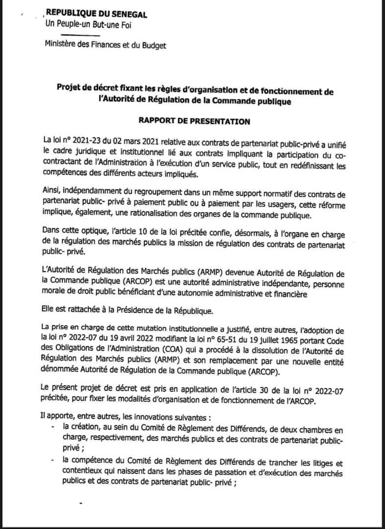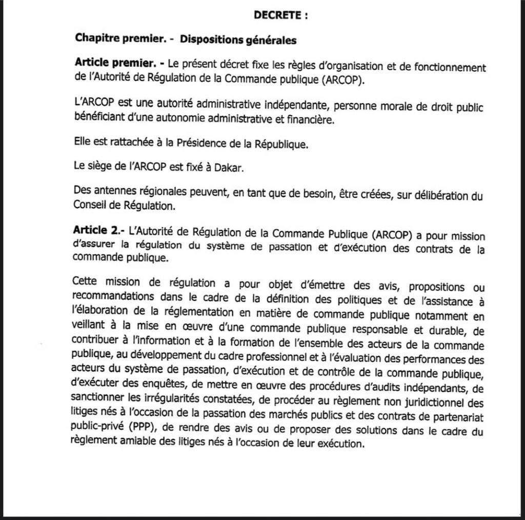 Le Président Sall avait demandé au Gouvernement, de préparer l’entrée en vigueur de cette réforme majeure qui va davantage asseoir la transparence et la bonne gouvernance au Sénégal. L’Arcop est compétente dans le traitement du contentieux né de la préparation, de l’attribution et de l’exécution des marchés publics et des contrats de partenariat public-privé.