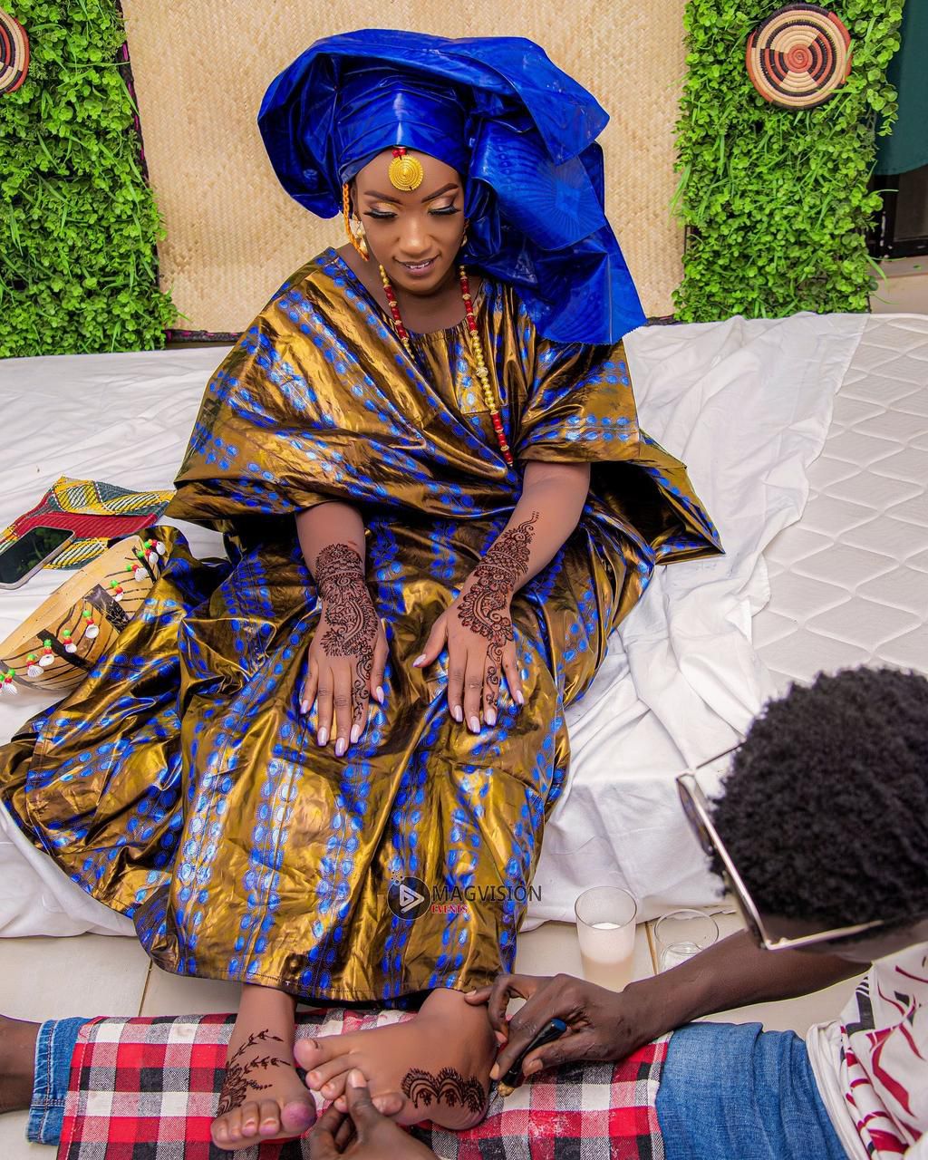 Allongée sur une natte, la mariée faisait appel à une maquilleuse professionnelle pour lui appliquer du henné sur les mains et au niveau des pieds. L'artiste dessinait ainsi de belles figures sur les parties désignées à cet effet, rendant la future épouse plus belle que jamais. Et la cérémonie était rythmée d'une belle musique traditionnelle, « Bogoman » et batteur de tam-tam assurant le spectacle.
