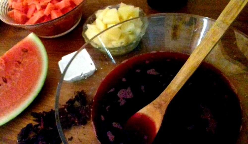 - Mixer à l’aide d’un blender, les morceaux d’ananas et de pastèques jusqu’à avoir un liquide homogène et lisse.