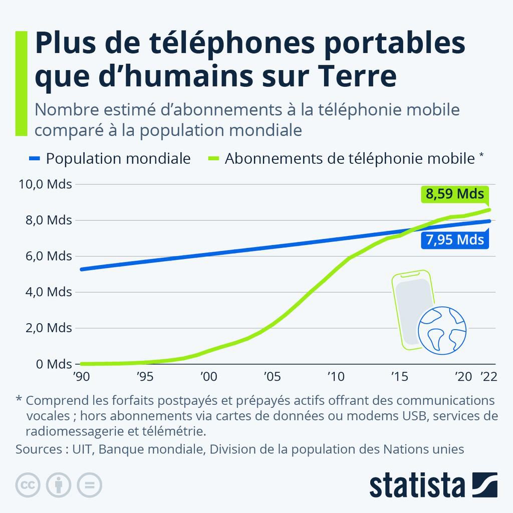 Ces chiffres sont confirmés par l’Union internationale des télécommunications (UIT). Selon elle, « plus de 8,58 milliards d'abonnements mobiles étaient utilisés dans le monde en 2022, alors que la population mondiale était estimée à 7,95 milliards d'habitants au milieu de l'année ».