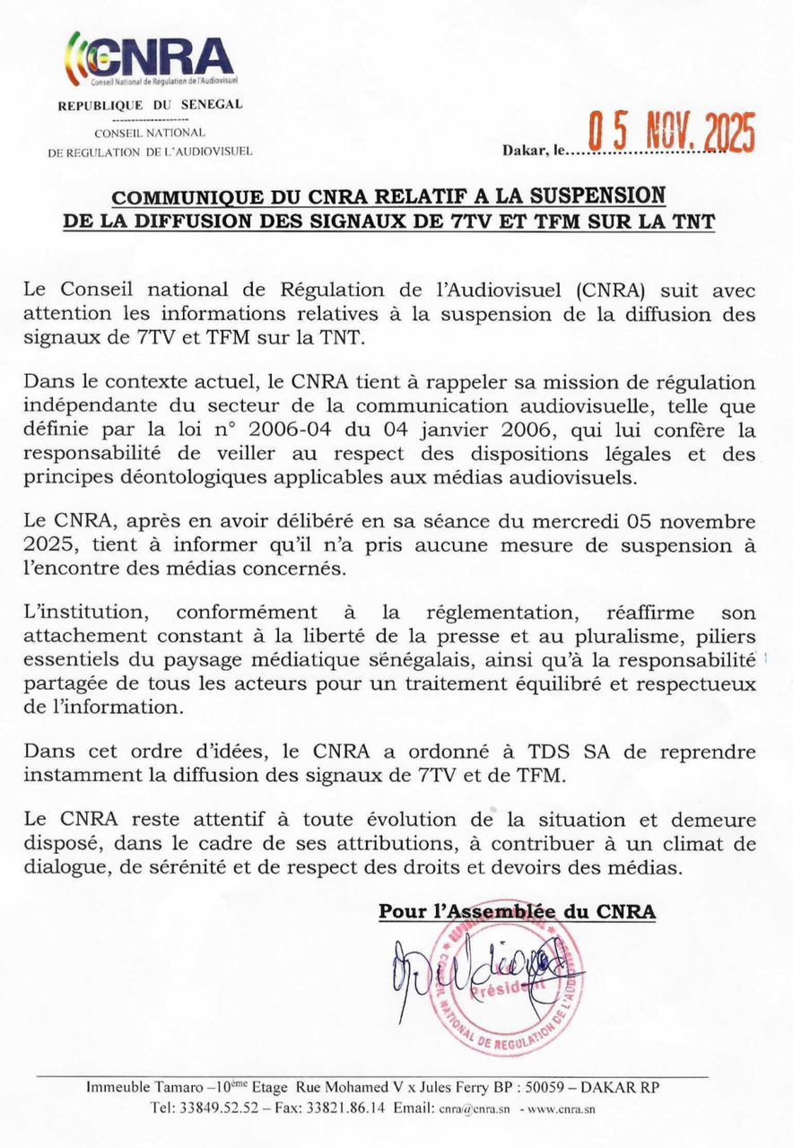 Le bras de fer autour de la diffusion de TFM et de 7TV sur la Télévision numérique terrestre (TNT) semble toucher à sa fin. Dans un communiqué publié à l’issue de sa séance du mercredi 5 novembre 2025, le Conseil national de régulation de l’audiovisuel (Cnra) a tenu à clarifier sa position. L’autorité de régulation affirme n’avoir pris aucune décision de suspension à l’encontre des deux médias, contrairement à ce que laissaient entendre certaines rumeurs. Par conséquent, elle ordonne à TDS SA, société chargée de la distribution du signal TNT, de reprendre immédiatement la diffusion des chaînes concernées.