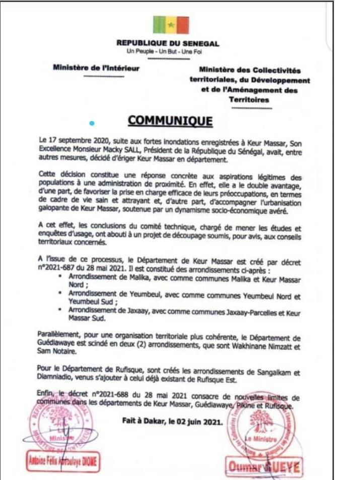 Le ministre Oumar Guèye informe qu’un autre décret est pris le même jour par le Président de la République consacrant de nouvelles limites de communes dans les départements de Keur Massar, Pikine, Guédiawaye et Rufisque.