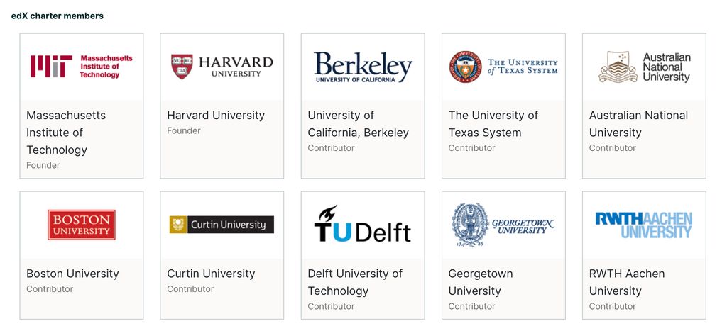 edX propose des cours en ligne de qualité, dispensés par des institutions qui partagent notre engagement en faveur de l'excellence de l'enseignement et de l'apprentissage. Il s'agit de plus de 8 000 cours dans des domaines tels que les sciences humaines, les mathématiques, l'informatique, etc. Et ce sont déjà plus de 44 millions d'utilisateurs enregistrés sur la plateforme.