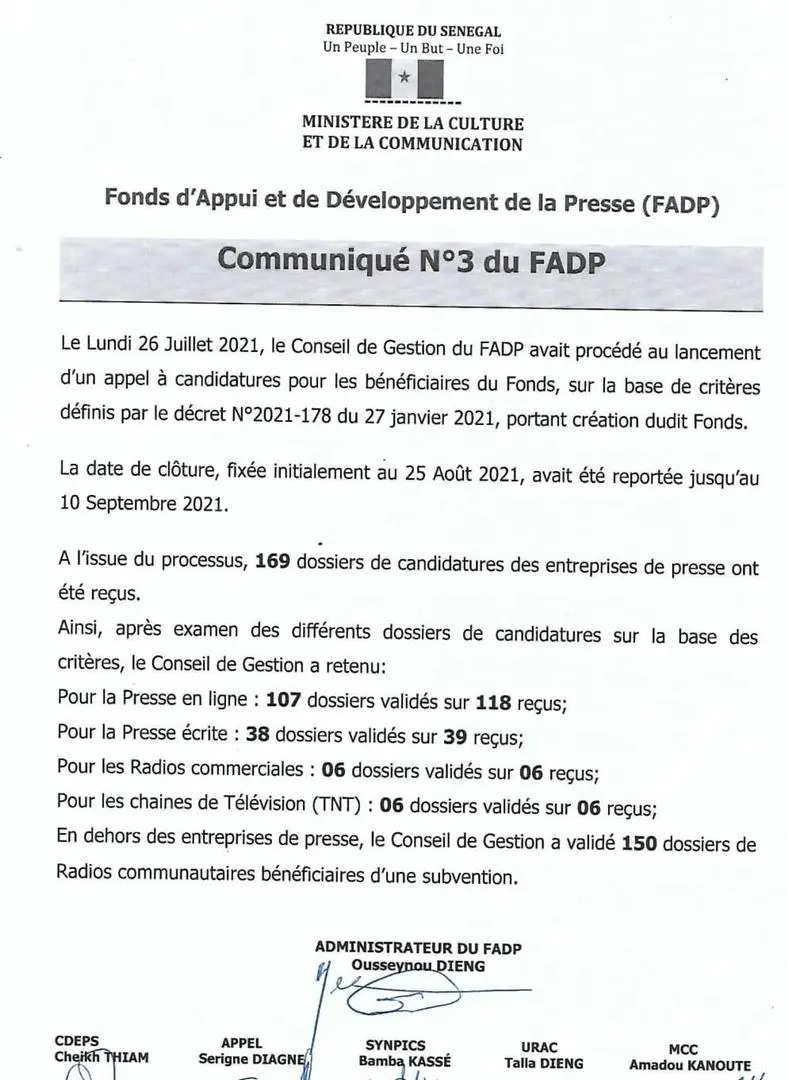“Ainsi, après examen des différents dossiers de candidature sur la base des critères, le Conseil de gestion a retenu, pour la presse en ligne : 107 dossiers validés sur 118 reçus, pour la presse écrite : 38 dossiers validés sur 39 reçus, pour les radios commerciales : 06 dossiers validés sur 06 reçus et pour les chaines de télévision (TNT) : 06 dossiers validés sur 06 reçus“, peut-on lire dans un communiqué parcouru par Pulse.