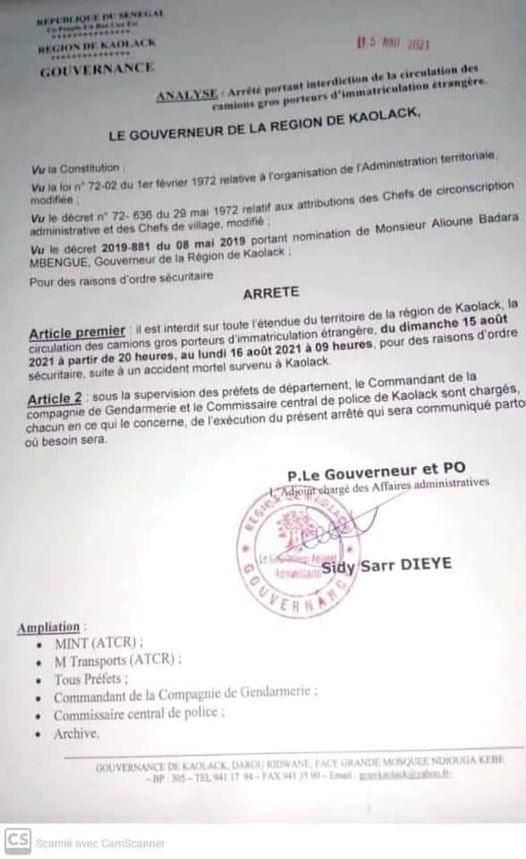 Le Gouverneur de la région de Kaolack vient de prendre un arrêté interdisant la circulation des camions étrangers.