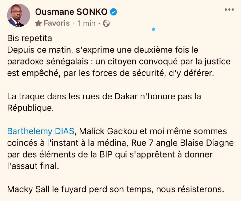 Sur Facebook, Ousmane Sonko s'est fendu d'un post pour dénoncer une situation similaire à ce qu'il a vécu en mars dernier. Barth est "coincé" depuis 10 heures du matin -heure à laquelle il devait répondre à sa convocation- dans les artères de Dakar, alors qu'il est attendu par le juge. Une situation que le leader de PASTEF décrit comme une "traque" pour "empêcher" un citoyen de déférer à une convocation par la justice.