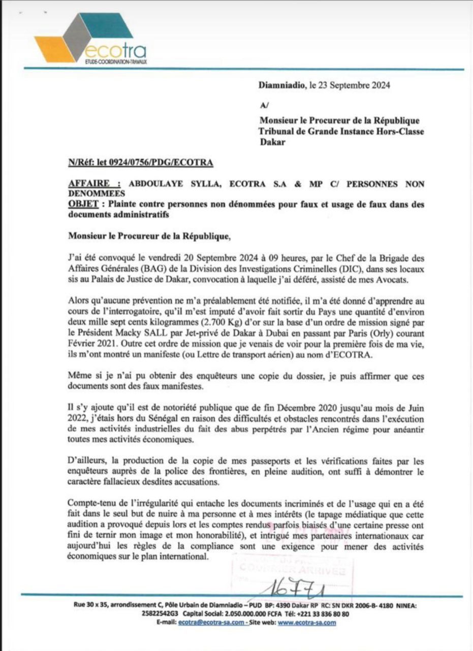 Le boss d'Ecotra a porté plainte pour faux et usage de faux dans l'affaire de 2.700 kg d'or pour laquelle il a été convoqué et auditionné à la DIC. Dans un document rendu public, il explique les circonstances de sa convocation et les accusations portées contre lui.