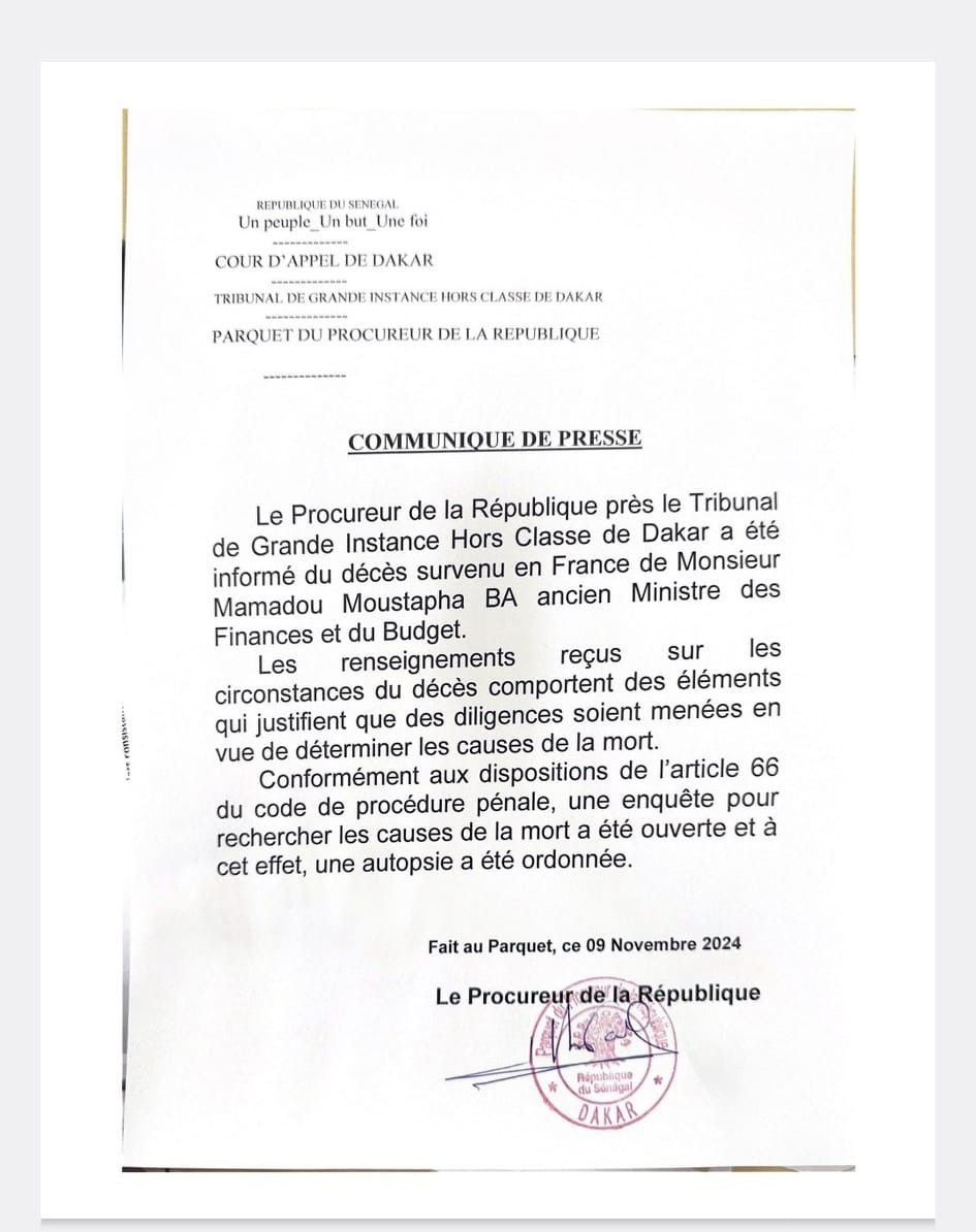 Le Procureur de la République près le Tribunal de Grande Instance Hors Classe de Dakar déclare avoir été informé du décès survenu en France de Monsieur Mamadou Moustapha Ba ancien Ministre des Finances et du Budget.
