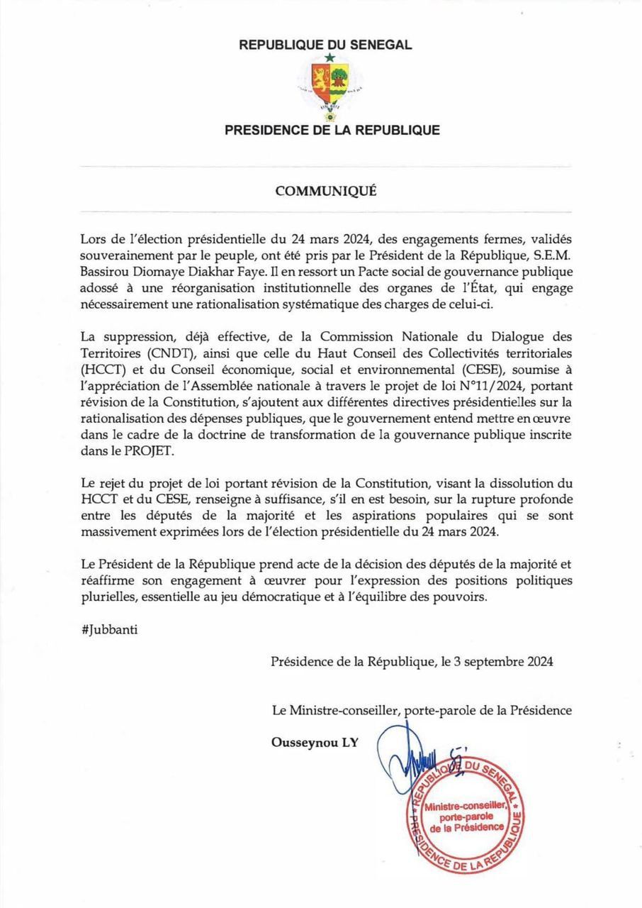 Le 3 septembre 2024, la Présidence de la République du Sénégal a diffusé un communiqué détaillant sa position suite au rejet par l’Assemblée nationale du projet de loi N°11/2024, qui visait à supprimer le Haut Conseil des Collectivités Territoriales (HCCT) et le Conseil économique, social et environnemental (CESE).