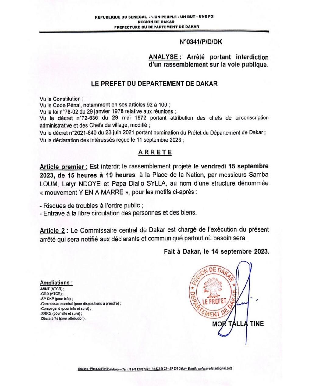 La demande de rassemblement a été déposée par Samba LOUM, Latyr NDOYE et Papa Diallo SYLLA, au nom d'une structure dénommée « mouvement Y EN A MARRE ». Mor Talla Tine a évoqué deux raisons pour justifier cette interdiction : Il s’agit des risques de troubles à l'ordre public, et entrave à la libre circulation des personnes et des biens.