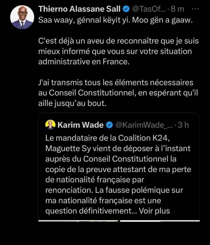 "Saa waay, génnal këyit yi. Moo gën a gaaw (NDLR : Mon gars sort les papiers. C'est mieux pour toi). C'est déjà un aveu de reconnaître que je suis mieux informé que vous sur votre situation administrative en France. J'ai transmis tous les éléments nécessaires au Conseil Constitutionnel, en espérant qu'il aille jusqu'au bout", écrit le président du parti République des Valeurs/Réewum Ngor de valeurs sur sa page Twitter.