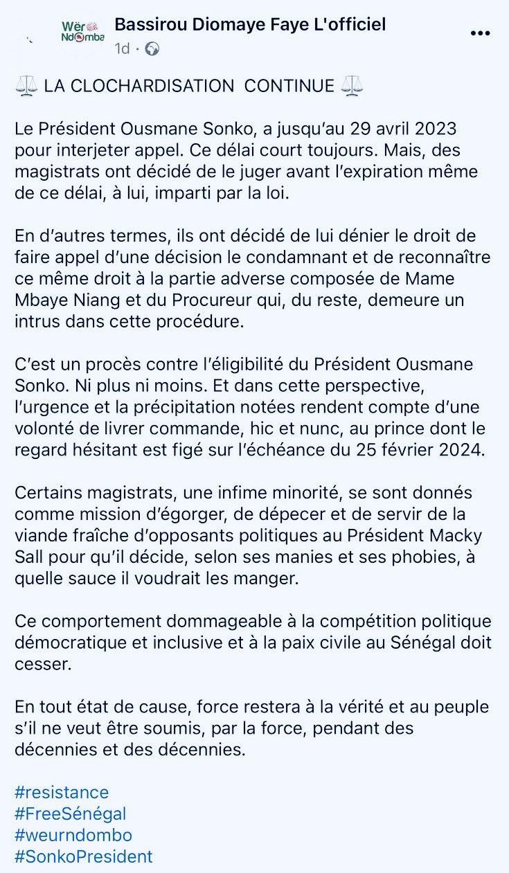 Les policiers ont effectué une descente inopinée au domicile du sieur Faye à Dakar, ce vendredi 14 avril 2023 ainsi qu'à son bureau. Mais Bassirou Diomaye Faye serait pour l'heure introuvable. Le leader du parti Pastef, Ousmane Sonko, s'est fendu d'une déclaration postée sur les réseaux sociaux pour dénoncer l'arrestation « arbitraire » de son proche collaborateur à qui on reprocherait « sa dernière publication Facebook sur le comportement de certains magistrats. », il s'agit d'un texte dénonciateur intitulé « La clochardisation continue ». (cf image jointe)