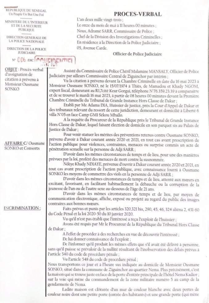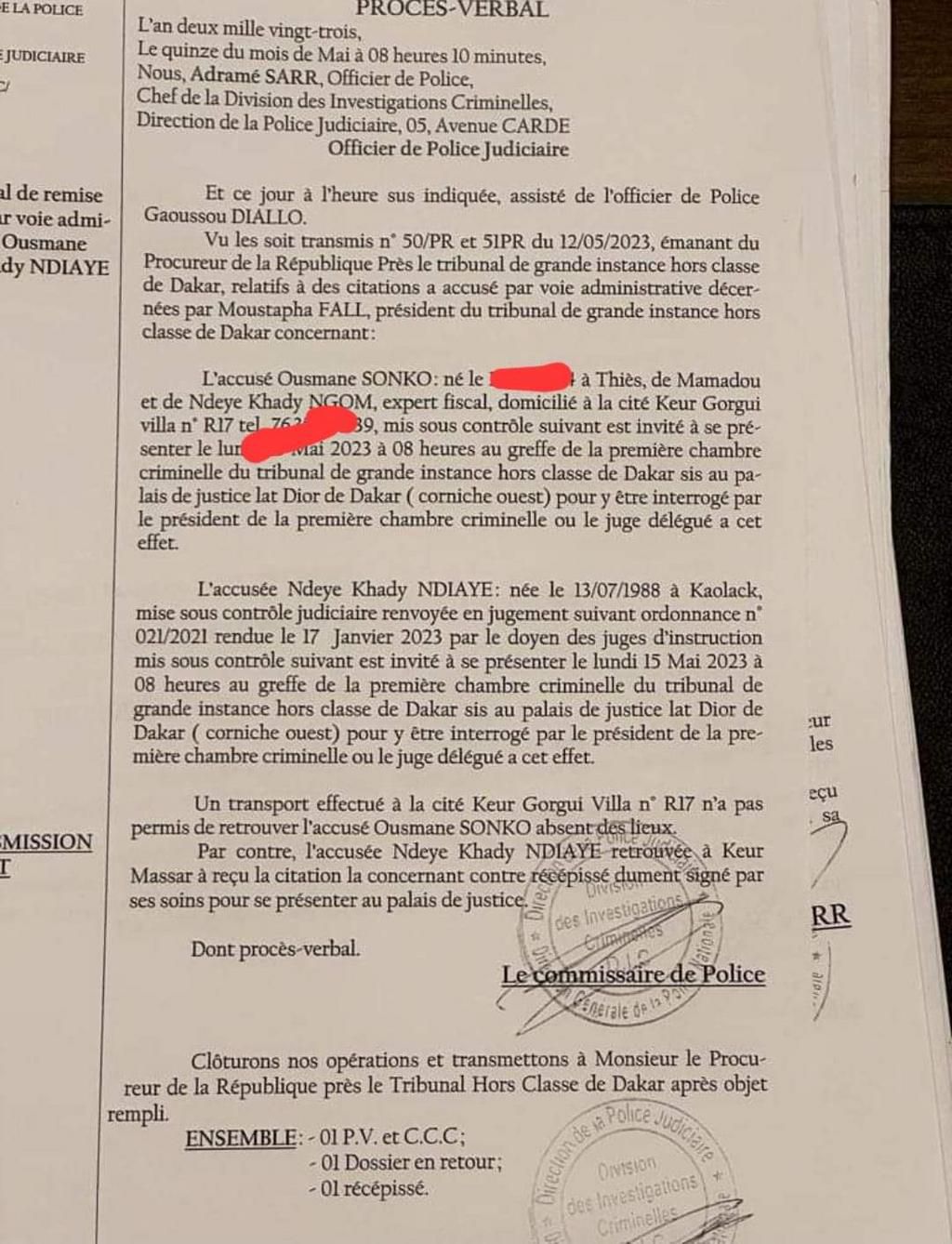 "Nous avons trouvé Ousmane Sonko à la devanture de la maison. Nous lui avons donné la convocation pour une comparution le 16 Mai 2023 à partir de 8 heures devant la première chambre criminelle de Dakar", précisent les policiers dans leur rapport. Ainsi, Ousmane Sonko a reçu sa citation à comparaitre.