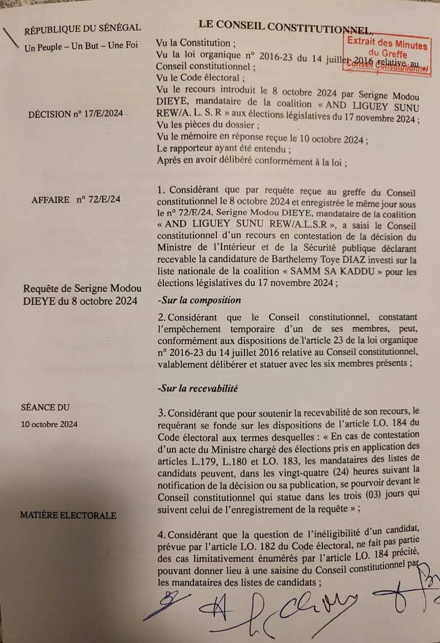 11 octobre 2024 à 08:06Le conseil constitutionnel a rejeté les recours déposés contre <a href="https://www.pulse.sn/news/politique/invalidation-de-la-candidature-de-barth-le-cc-na-pas-encore-statue/8wz3cfe"><em>Barthélémy Dias</em></a> et Ousmane Sonko pour les élections législatives anticipées du 17 novembre.barthelemy dias refleja