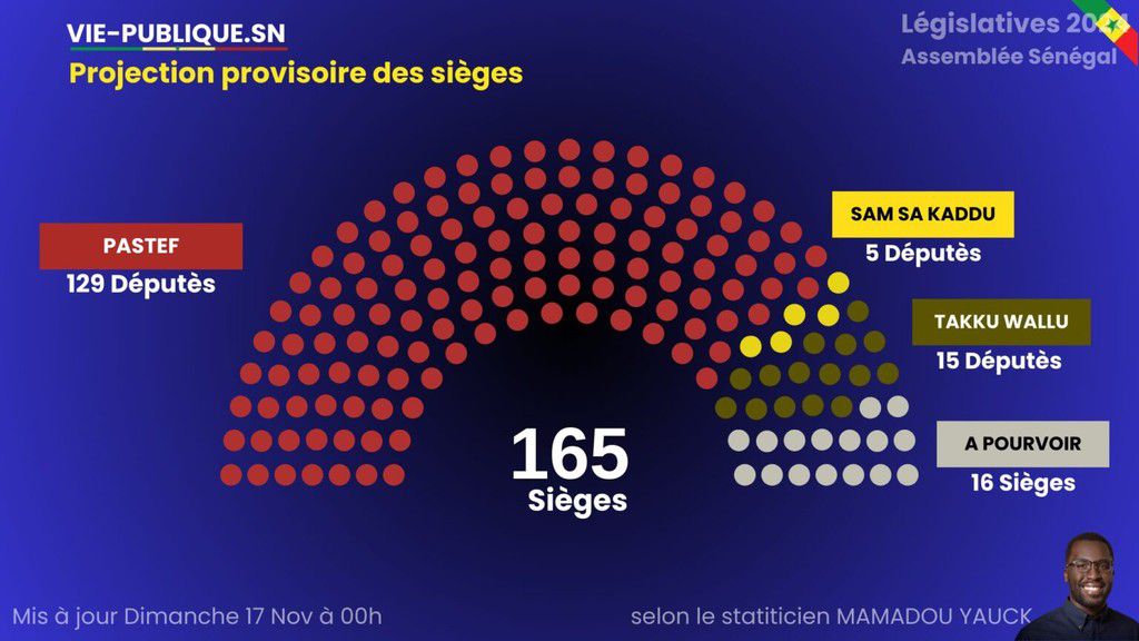 Ces projections de Monsieur Yauck renforcent l’avance massive de Pastef, plaçant le parti au pouvoir en position de force pour constituer une majorité écrasante à l’Assemblée Nationale. Takku Wallu Sénégal et Sam Sa Kaddù occupent des positions marginales, tandis que 16 sièges restent encore à être attribués.